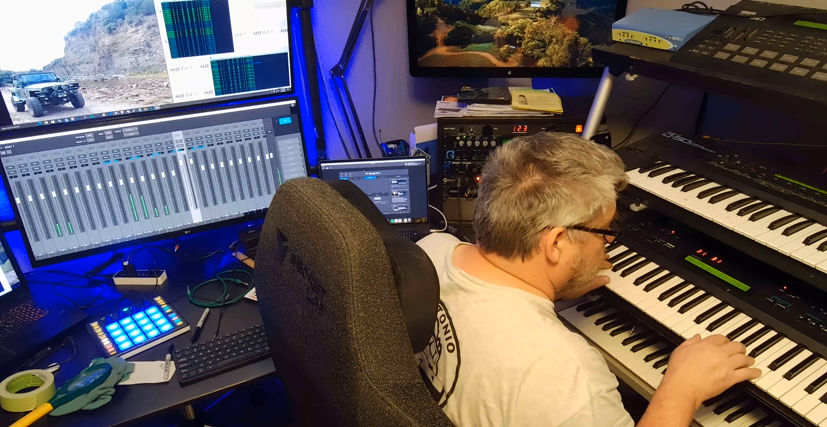 Jesse has been playing and writing music since he was 8 years old. Starting out on piano, his interest in computers and programming in high school collided with his music interest in the mid 80's with the release of the Yamaha DX-7. He still uses his DX-7II as his main synth, but he also has another 80's classic synth - Roland D-50 along with several other modules, drum machines from the 90's and 2000's. He also plays bass and drums.